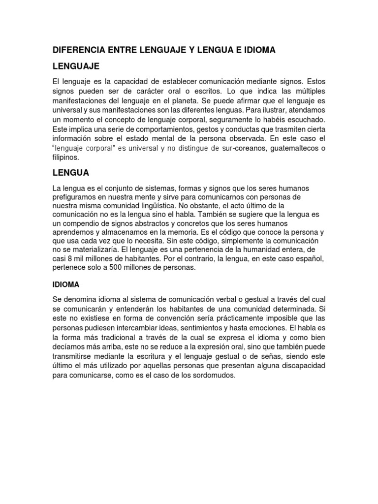 La articulación da vida a un lenguaje. Es una capacidad humana ya que nuestro cuerpo está diseñado para poder comunicarse a través del lenguaje. This question was just asked and here is a link. 18 de agosto de 2015 DIFERENCIA ENTRE IDIOMA Y LENGUAJE El idioma es la lengua de un pueblo o nación que la mayoría de sus habitantes la utiliza para comunicarse y les caracteriza es el sistema de comunicación propiodel ser humano. Si bien es cierto que la lengua el idioma y el dialecto se relacionan dentro de una misma gramática estructural cada uno muestra definiciones distintas. Un lenguaje es un modo de expresión del pensamiento mediante sonidos articulados. El habla es la facultad de articular palabras también esta acepción la adopta el término lengua. Hay una diferencia entre lengua y lenguaje. 3 725 palabras Publicado.